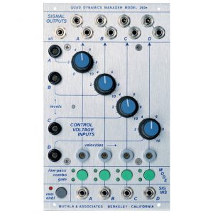 The Buchla 292e Quad Dynamics Manager Module is a quad low pass gate, designed in the classic Buchla synthesis style. It can be used as a low pass filter on its own or as a LPF and VCA combo for the iconic Buchla percussive pluck and plink tonality.